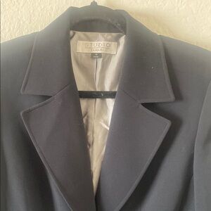 The Studio black blazer features a sleek and structured design, perfect for formal settings. Its minimalist style and high-quality fabric ensure a polished and professional appearance.