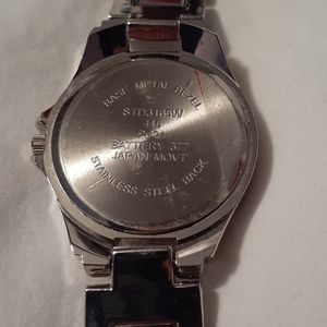 Silvertone with faux diamonds around the face & on 1, 2, 4, 5, 7, 8, 10 & 11 on the face.