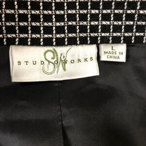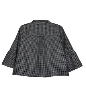 STUDIO WORKS Black, White and Metallic Silver Plaid Check Bell Sleeve Button Front Blazer Jacket -Size Large. No visible flaws. Excellent pre-owned condition. Like New!