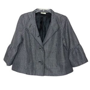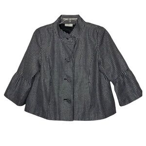 STUDIO WORKS Black, White and Metallic Silver Plaid Check Bell Sleeve Button Front Blazer Jacket -Size Large. No visible flaws. Excellent pre-owned condition. Like New!