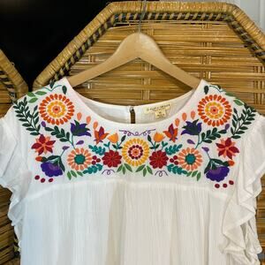 Beautiful Studio West Apparel embroidered peasant dress in women’s size XL. White crinkle rayon shell with soft cotton lining and vibrant multicolor floral embroidery at the yoke. Features flutter sleeves, keyhole button back, and a relaxed flowy fit. Perfect for cottagecore, boho festivals, vacation, or summer casual wear.