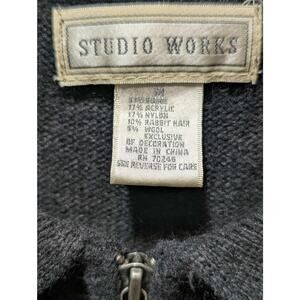 The Studio Works Christmas Sweater is a black wool blend sweater with a collared neckline and long sleeves, perfect for the holiday season. It features intricate beadwork and embroidery embellishments, adding a touch of festive charm. This cardigan sweater in size M is ideal for Christmas, holiday gatherings, or parties, and is designed for a regular fit, making it both stylish and comfortable for the winter season.
