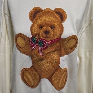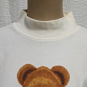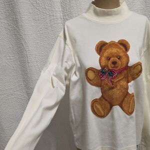 This charming long sleeve tee from Studio Works features a delightful teddy bear graphic in warm brown tones on a soft cream background. The relaxed fit and mock turtleneck make it perfect for casual wear, while the playful design adds a whimsical touch to your wardrobe. The teddy bear has a Christmas bow around his neck. There is a little of fraying, as shown in last picture. Feel free to ask any questions!
