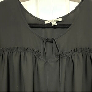 Studio Works Floral Embroidered Hemline Black Sleeveless Top Tie/Keyhole front with smocked front and back Sz Large 100% polyester
