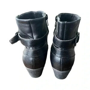 Studio Works Gelna women’s ankle boots, sz 7.5, black faux leather, side zipper, 2” rubber block heel, rubber sole, very comfortable, preowned, good used condition.