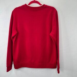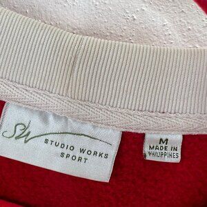 Studio Works pullover sweatshirt in red. Heart applique with embroidery, beading, rhinestones and buttons, double neckline, long sleeves, v-neck over crewneck look, good condition. Size M.