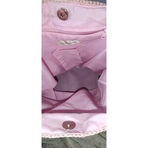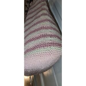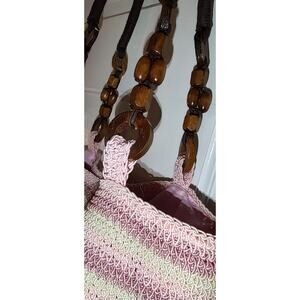 Studio works mauve, pink, & cream woven bag with brown woven handles and wood accents at the base of the straps.