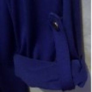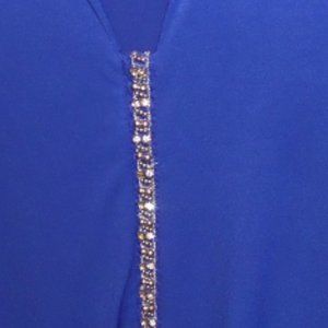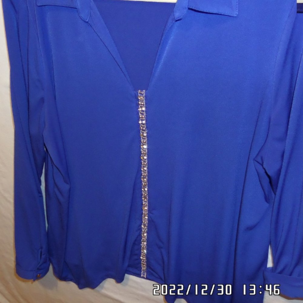 Beautiful blue top with rhinestones. Very comfortable.Looks good with skirt and heels or jeans. No rips or stains. Sleeves can be rolled up to 3/4 length or buttoned down all the way. Questions? Leave a comment below!