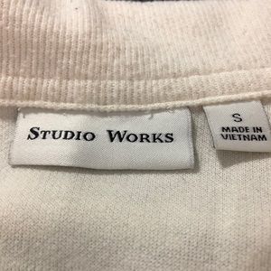Studio Works Ribbed Long Sleeve Collared Top, Size Small, Cream. Beautiful top in great condition. Very soft and comfortable ribbed corduroy material. Laying flat armpit to armpit measures approx 18 inches. Shoulder to hem measures approx 23.5 inches. No flaws.