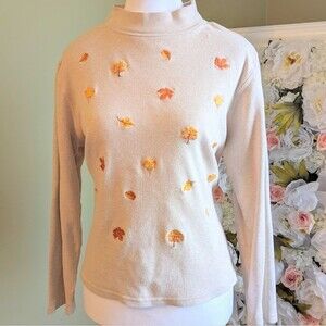 Studio Works Vintage Fall Leaf Beige Pullover Mock Neck Sweater Size Medium
