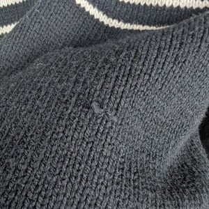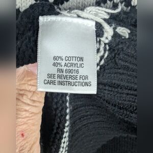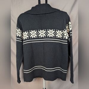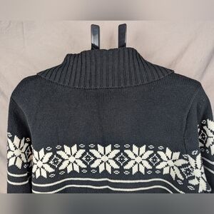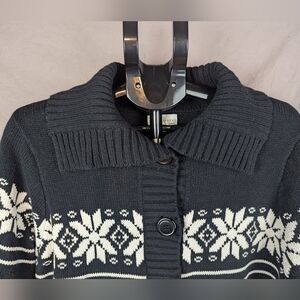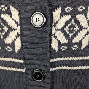 This plus size cardigan has easy to use large buttons. and snowflakes design, large collar, and is from a smoke-free home. Photos show 1 SNAG on the back right shoulder.