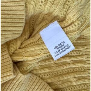 This Studio Works sweater is in excellent pre-owned condition, showing no stains, tears, or flaws. It features a charming yellow cable knit design and a flattering V-neck, perfect for adding a pop of color to your wardrobe. This cotton sweater is comfortable and stylish, making it a great addition to any outfit.