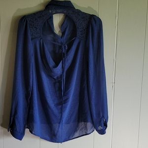 Beautiful blue blouse! Sheer material with lacey upper back. Drooped picture. Design style. See pictures. Great condition!