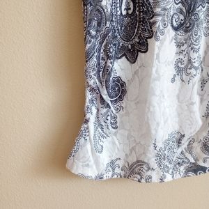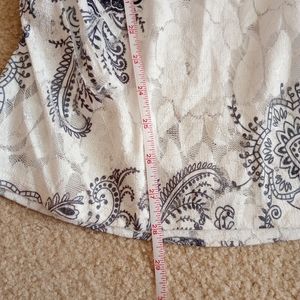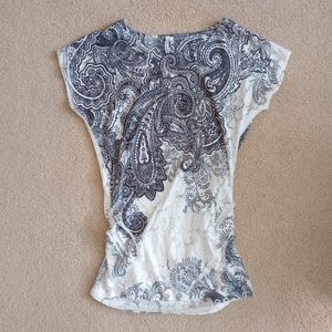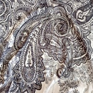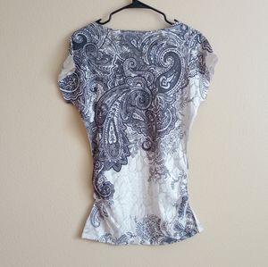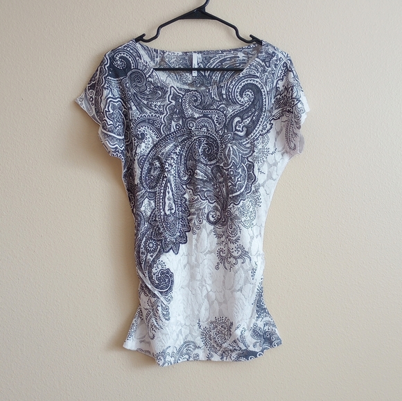 Super fun and sexy top with a handkerchief style pattern and bedazzing on the front. The length is long, like a tunic style that hugs your hips. Has ruching along both sides to keep it form fitting around the bottom. Has a wide neckline to show off a shoulder or collarbone.