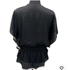 Elegant black blouse. Features intricate cream embroidery. Short sleeves with a relaxed fit. Perfect for any occasion. Excellent condition.