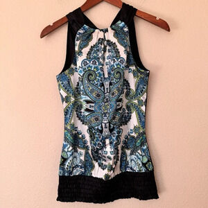 This Studio Y blouse top is a size XS in a blue and white paisley pattern. It features a halter neckline with a tie back keyhole closure. Made of lightweight satin fabric with a regular fit, this sleeveless top is perfect for summer and spring occasions, such as parties, casual outings, or business events. Easy care and machine washable, it adds a colorful and vibrant touch to your wardrobe.
