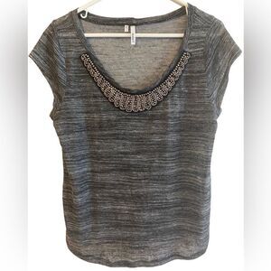 Studio Y T-shirt, size large. Dark gray lightweight material with a jeweled neckline. New without tags, never worn, and in excellent condition.