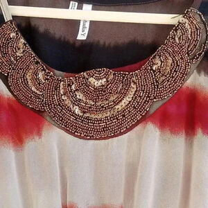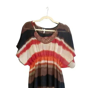 Like new condition. Studio Y size Small. Retail $52. Unlined chiffon fabric. Earth tone ombre. Metallic beaded scoop neckline. Flutter sleeves. Elastic waistband. Flowy fit. Chest 36 inches. Shoulder to hem 28 inches. Smoke and pet free home.
