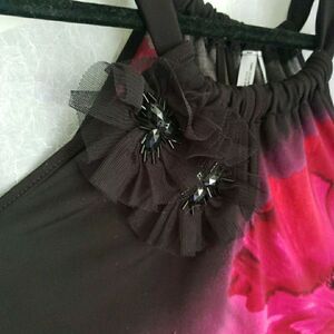 This Studio Y tank top in black with red maroon floral print is a feminine and romantic addition to any woman's wardrobe. The round neckline and pullover closure make it easy to wear, while the lightweight lace fabric is perfect for the summer and spring seasons. The halter strap and ruffle accents add a touch of girly charm, making it ideal for casual occasions like a date night or a day out. With its classic floral pattern and stylish fit, this tank top is a must-have for any woman looking to add a pop of color and femininity to her outfit.