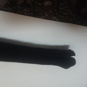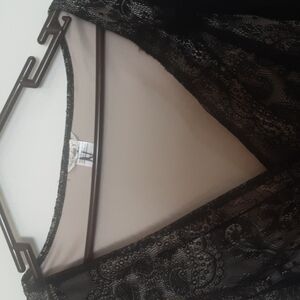 longsoft sleeves, black lace overlay over tan lining, 2 straps of velour/ velvet lead to a back tie, decent wearable pre-owned condition showing very light pilling noted, no holes or stains, size L by Studio Y . measurements are roughly 25" from shoulder to hem and about 17" pit to pit, plunging v neck reminds of a wrap. pet friendly non smoking home