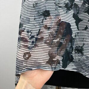 Studio Y Womens L Sheer Floral Striped Hi-Lo Hem Tunic Blouse Top Keyhole Back.