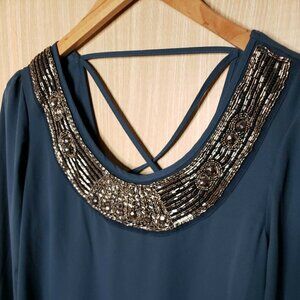 Studio Y NWOT women’s green flowy tunic blouse with beaded embellished neckline Large. New condition. Measurements are: 25” sleeve, 28” from shoulder to shortest part of hem, and 19 ½" from armpit to armpit.