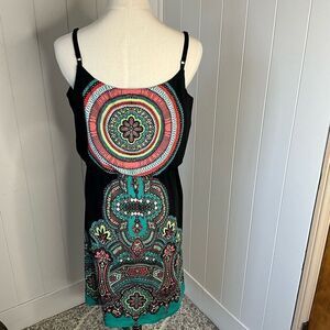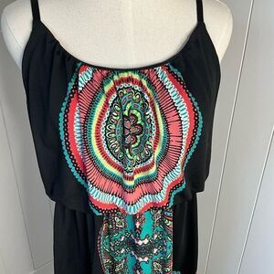 Studio Y Womens Size Large Mini Sundress Black Turquoise Print Adjustable Straps Cruise Resort Wear