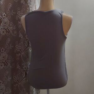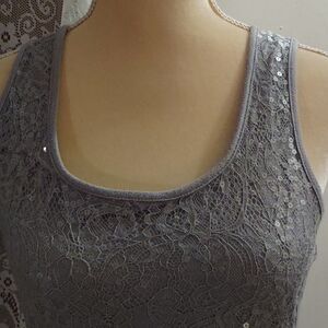 Studio Y, Gray sleeveless lace and sequined tank top, plain back scoop neck, size medium, very versatile can be worn alone or under a jacket, lots of sparkle and festive for a great night out, excellent condition