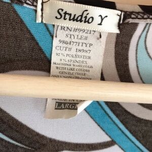 Studio Y tie back psychedelic abstract print blouse size large. Gently used. 92% polyester, 8% spandex.