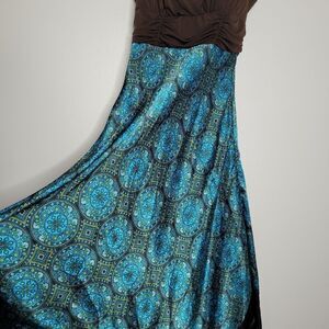 Studio Y dress: blue brown, boho print, handkerchief hem