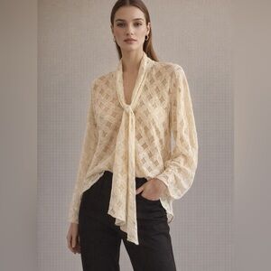 Scoop neck black blouse with 3/4 sleeves. Sleeves have elastic band, as does the bottom. It’s a little hard to see in the picture, but front has pleating detail.