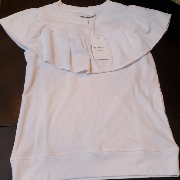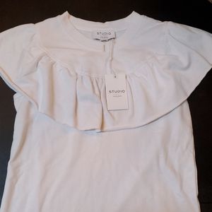 White jersey material with banded bottom and adorable ruffled top. Super soft