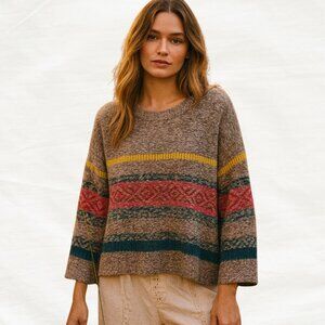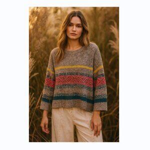 Beautiful Fair Isle knit sweater from Studio by JPR (John Paul Richard). Features a soft taupe base with colorful stripes in yellow, pink, and teal. The relaxed fit and warm acrylic fabric make it perfect for layering through cooler months.