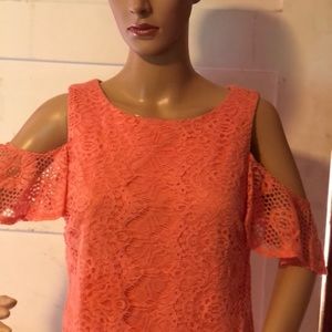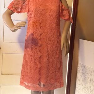 BODY 80% COTTON/ 40%NYLON LINING 100% POLYESTER beautiful lace dress, off shoulder sleeve Color coral Made in Vietnam