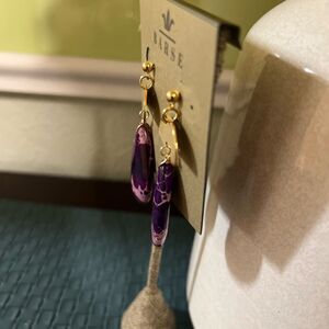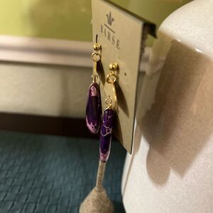 Chic earrings with gold accents and vibrant purple drops. Ideal for elevating your style. Length 2 1/4”