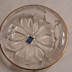 In like new condition. Gilded poinsettia tray . Comes with box . The box is in good condition.The tray is approximately 5 inches in diameter. Would make a good candy dish.
