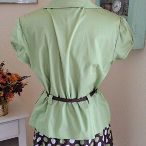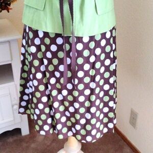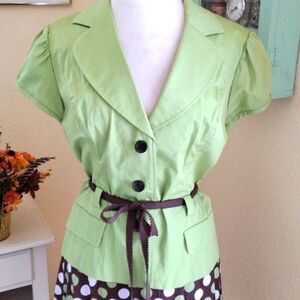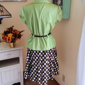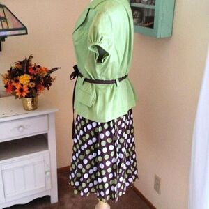 Two piece set with belted jacket and polka dot skirt. Jacket measures 42 at chest, 38 at waist, grosgrain ribbon belt to adjust, 42 at bottom hem. 22 long from shoulder to hem. Skirt is lined, side zip. Measures 34 at waist, 48 at hips, 26 long from waistband to hem. Something different and fun.