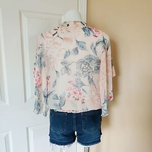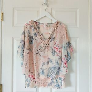 Studio Y jewel embellished floral smocked hem blouse sz M