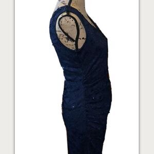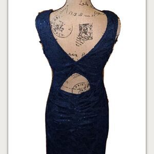 Navy blue dress. Ruched sides and open back. Slips on and has a lace and sequin overlay. In good condition