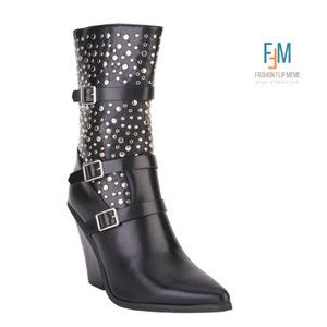 Studs and Buckles Mid-Calf Chunky Heel Boot (Women's 41)