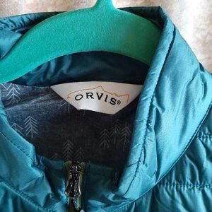 EUC teal colored vest by Orvis in size Medium. Quilted and seamed details. Two zip close hip pockets and one internal zip pocket (which contains the stuff sack for this vest). Zippers are a contrasting green color.