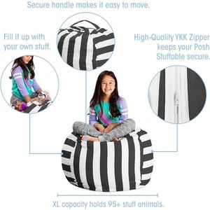 Stuffable Kids Stuffed Animal Storage Bean Bag Chair Cover - Childrens Toy Organizer, Large 38" - Canvas Stripes Gray and White