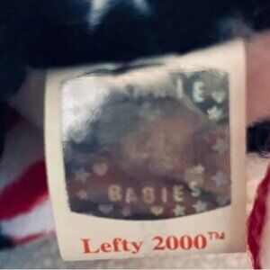 Lefty 2000 is a sweet plush donkey. He has dark blue material covered in white stars on his left side and red and white stripes on his right side. His face and belly are white with red and dark blue stars. He has black button eyes and a black muzzle. His inner ears and hooves are also black.