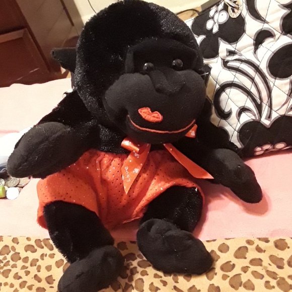 It is a black monkey with a kiss on his cheek with red sparkles on shorts.