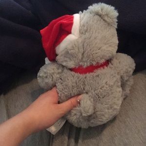 Grey fur, on the bottom of its feet there are snowflakes, and it has a Santa hat and scarf