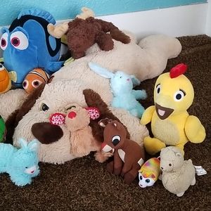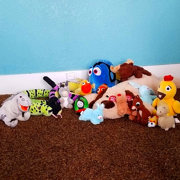Two long snakes wild republic brand,jurasik world dinosaur, Dori &Nemo,chica the chicken,big dog floor pillow,thomas and friends Percy,rudolf,moose, rabits,sheep,burrow dogs.all of them in exelent condition.