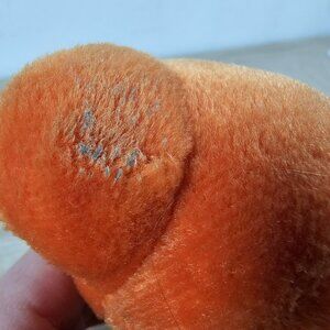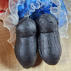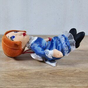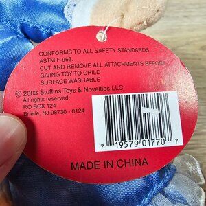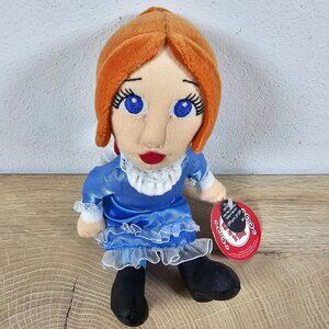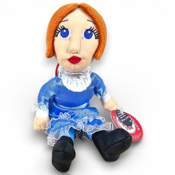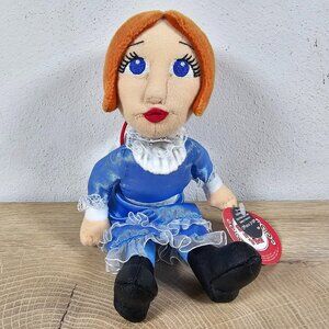 Pre-owned Stuffins 'Miss Jessica' beanbag plush doll from Santa Claus Is Comin' To Town. Measures approx. 8" long when lying flat. Hang & tush tags still attached, marked 2003. Vintage. Plush is in fair pre-owned condition. Faux leather material on her boots has peeling/wear to it, stain on back of hair (Photo #7). Please see pics.
