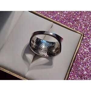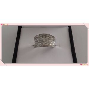 This ring is out of this world and touts both comfort and beauty. With a retail value of $999, you are getting an incredible bang for your buck. A total of one carat of small round cut genuine diamond gemstones are pave set into a wide band setting which has a slight concave design. The diamonds are H-I in color and I1-I2 in clarity. The band measures 1/2" in width and the diamonds are hand set into a smooth finish for comfortable wear. The band is done in .925 solid sterling and is stamped for authenticity. It has then been layered in pure platinum for durability and shine. It is size 8.