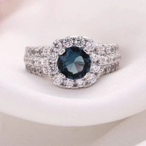 Stunning 2.5ctw Blue Sapphire / Diamond Halo Bridal Ring 925 Sterling Silver