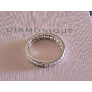 This gorgeous eternity style band ring features 3 carats of shimmering princess cut DIAMONIQUE stones that are channel set and sparkle all the way around the diameter of the band. The smooth prongs ensure a safe and comfortable fit. The setting and band are done in .925 solid sterling silver and is stamped for authenticity. It is plated with pure platinum for a lifetime of sparkle and durability. It is size 7. This stunner will give you the “big money “ look without having to shell out the big money. Comes in a white velvet gift pouch and pink Diamonique gift box.